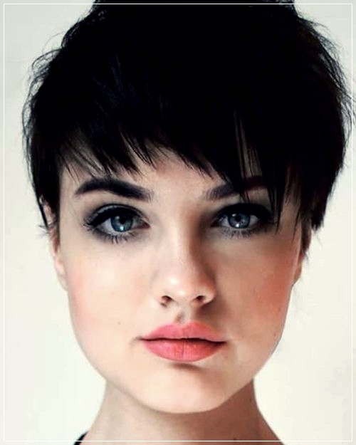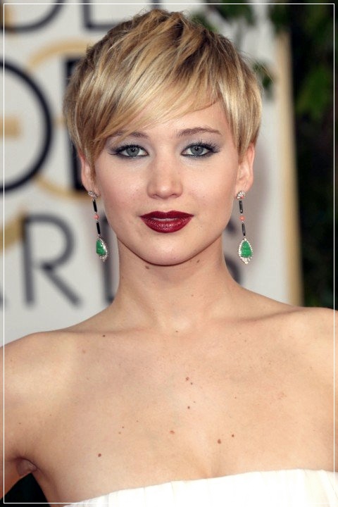 Short hair like Jennifer Lawrence’s works great on round faces. Add volume to the top of your head with layers, and asymmetrical bangs balance out the roundness.
