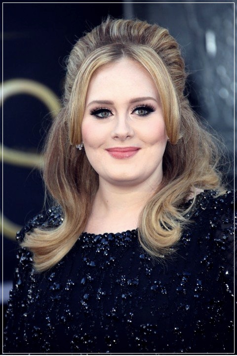 Adele is famous for using a lot of height in her hairstyles to elongate her face, but she always keeps long bangs that hang down on either side of her face.