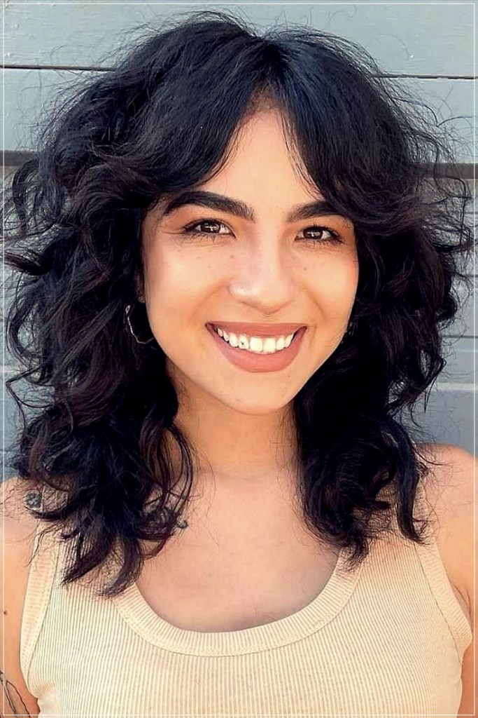 Wavy hair and bangs over the eyebrows, a very youthful and flattering look.