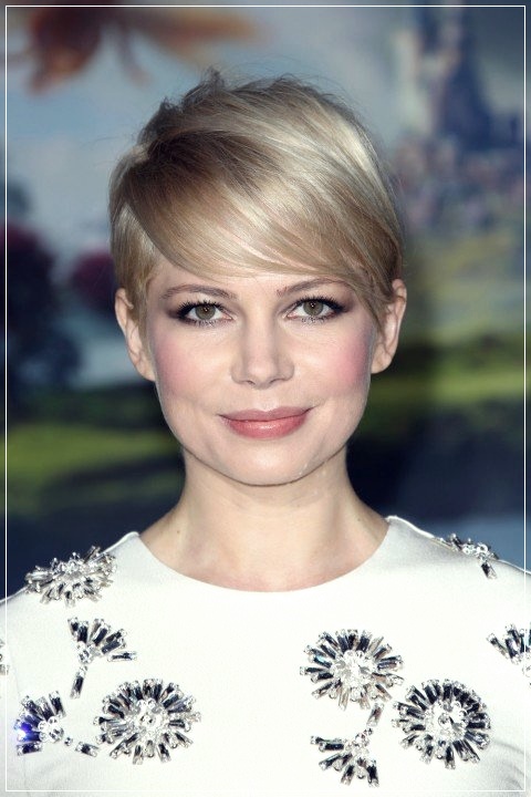 Michelle Williams is an expert when it comes to dressing her face. She combs her bangs diagonally to break the curvy lines of her face.