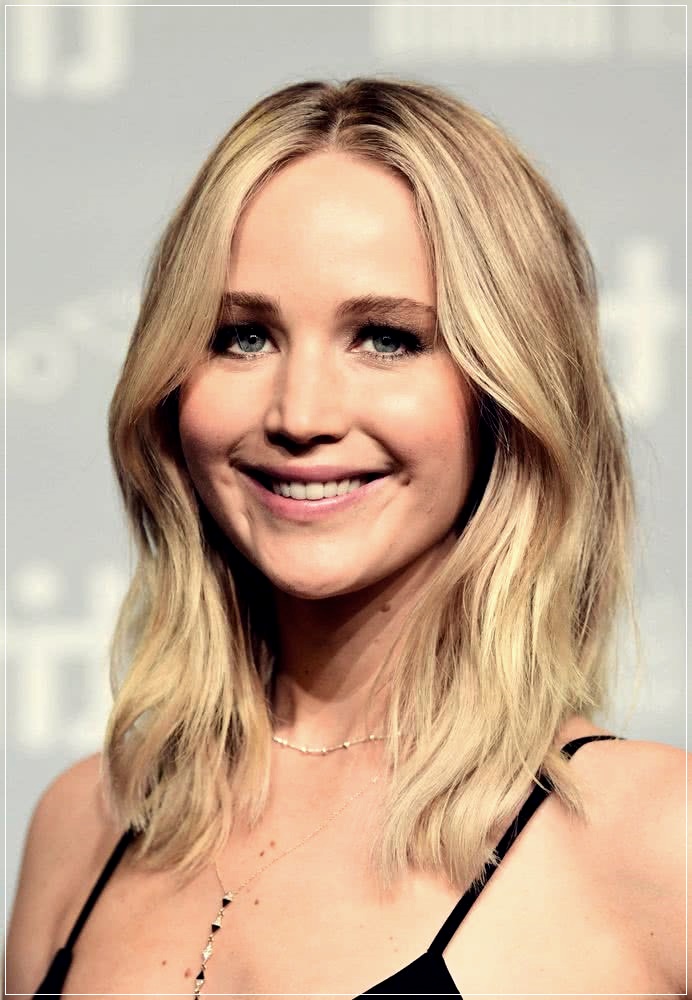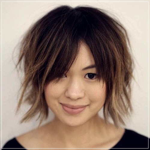 Short hair like Jennifer Lawrence’s works great on round faces. Add volume to the top of your head with layers, and asymmetrical bangs balance out the roundness.