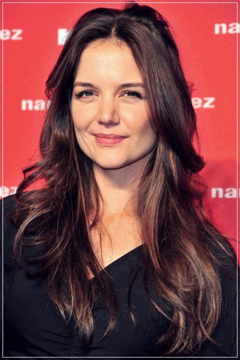 The longer the hair, the better. Katie Holmes elongates her face with a long haircut, creating weight on her ears and chin with soft waves that also hide the width of her face.