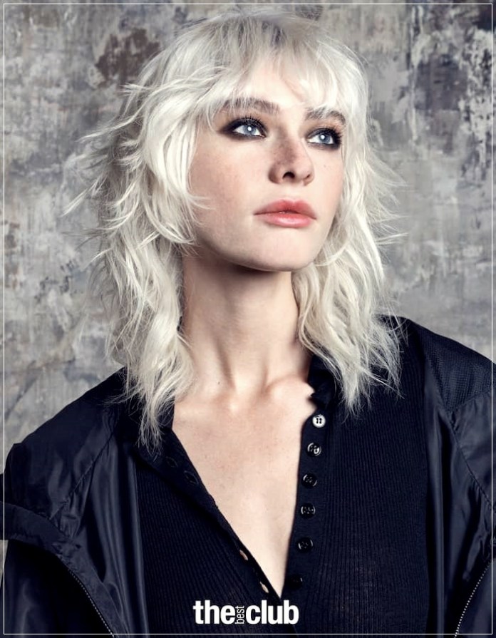More daring is the mullet cut on medium ice platinum-colored hair with accentuated scales that reveal the face chosen by The Club for WELLA.
