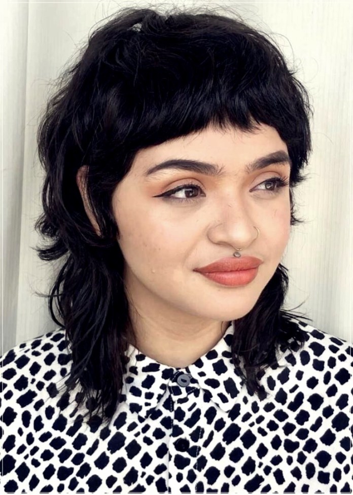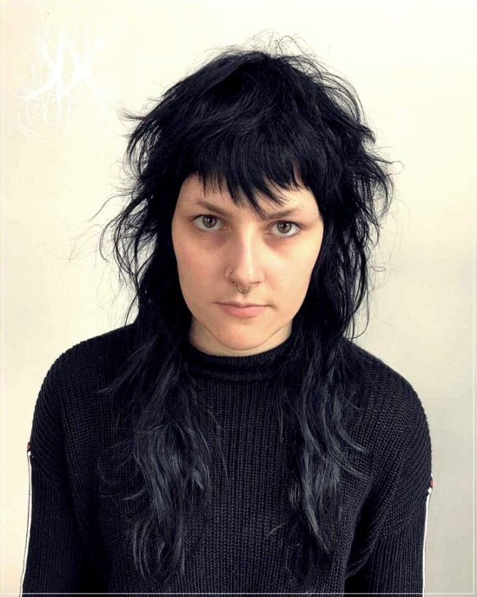 The medium wolf cut consists of cascading multi-layered hair, the layers start at the temples, and the hair gradually fades to the ends. Create a hair with a lot of volume.